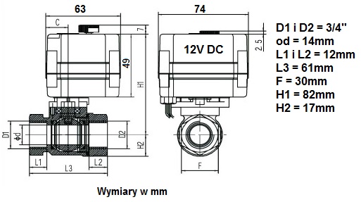 Zawór kulowy 3/4" wyposażony w siłownik elektryczny na 12V (napięcie stałe)